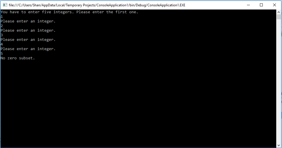 We are given 5 integer numbers. Write a program that finds those subsets whose sum is 0. Examples: - If we are given the numbers {3, -2, 1, 1, 8}, the sum of -2, 1 and 1 is 0. - If we are given the numbers {3, 1, -7, 35, 22}, there are no subsets with sum 0.